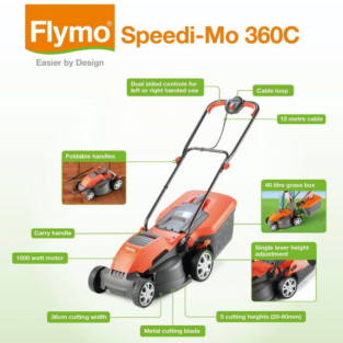 Buy the Flymo Speedi-Mo 360C, a powerful 1500W electric rotary lawn mower with 36cm cut width, 40L grass box and 5 cutting heights. Ideal for medium to large